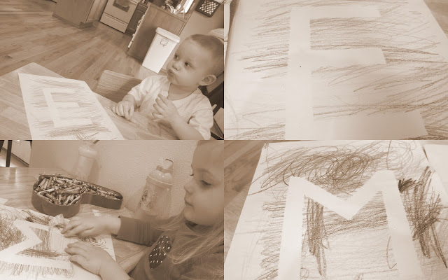 1.) I used scotch tape to make an M and E on some construction paper. (M for Melanie, E for Easton)